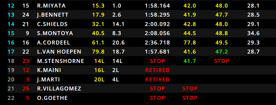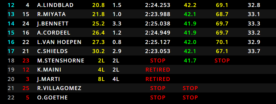 8/21 – Perde terreno Fornaroli, che viene passato anche da Crawford, e scende in ottava posizione. Intanto, problemi per Stenshorne, che rallenta improvvisamente. Peccato per il pilota norvegese, che stava disputando una grandissima gara.