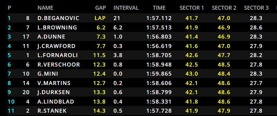 13/21 – Ancora una volta riparte perfettamente Beganovic, che si difende da Montoya. Dietro, Dunne passa Browning e sale in terza posizione, mentre Minì difende strenuamente la sua quinta posizione dall’attacco di Jak Crawford.