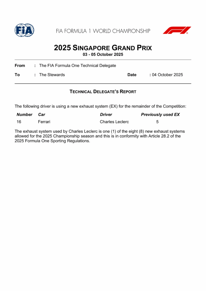 Secondo la normativa della Federazione, ogni pilota ha a disposizione otto scarichi per l’intera stagione 2025. Quello montato da Leclerc è il sesto esemplare utilizzato fino a questo momento e rientra pienamente nei limiti imposti dall’articolo 28.2 del regolamento sportivo. Nessuna penalità dunque per Charles.