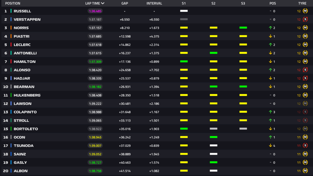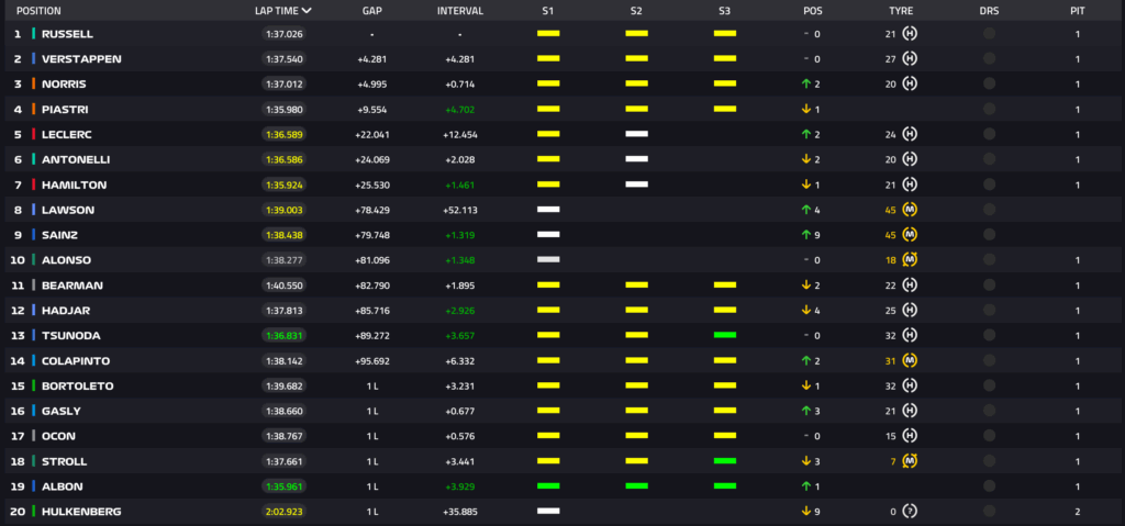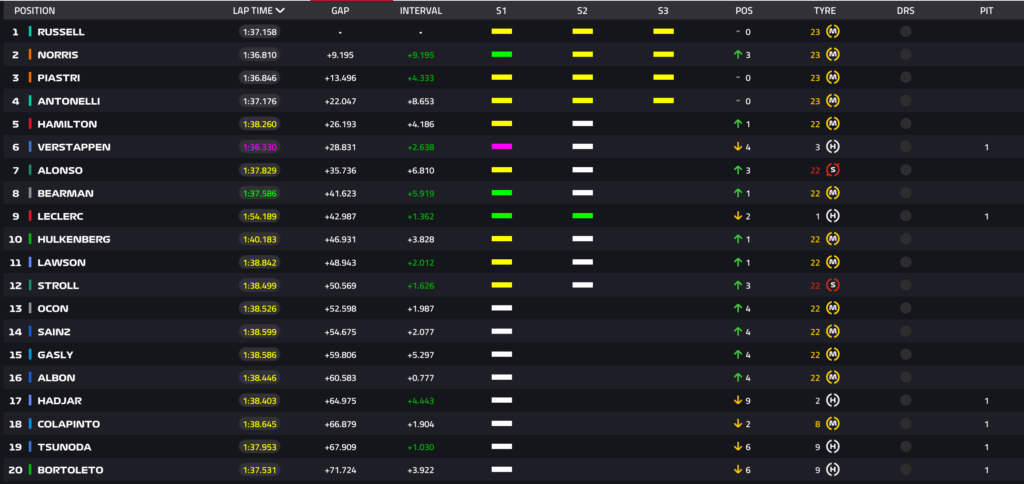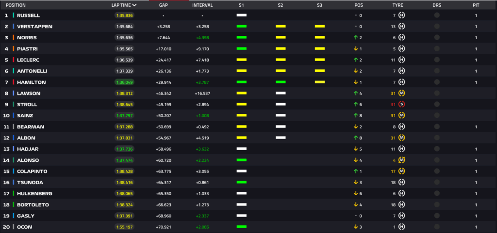 Giro 27 – Piastri è leader in questo momento: Verstappen a 3.5 secondi da Russell.