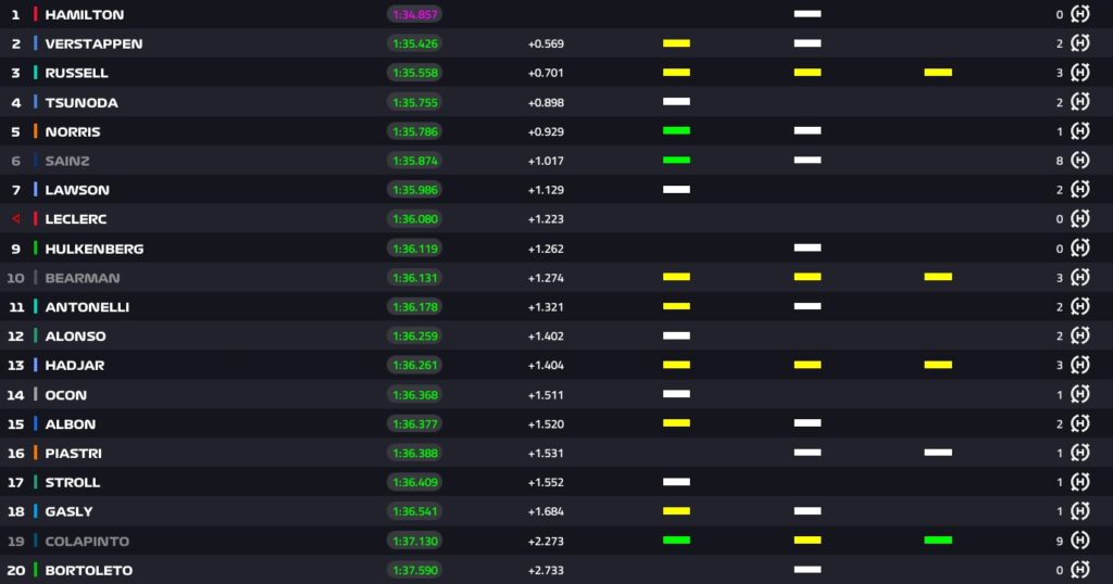 19:48 – Hamilton balza in prima posizione stampando un 1:34.857, sempre con gomma Hard. Tempi ancora sotto la media rispetto alla FP1 dell’edizione 2024.