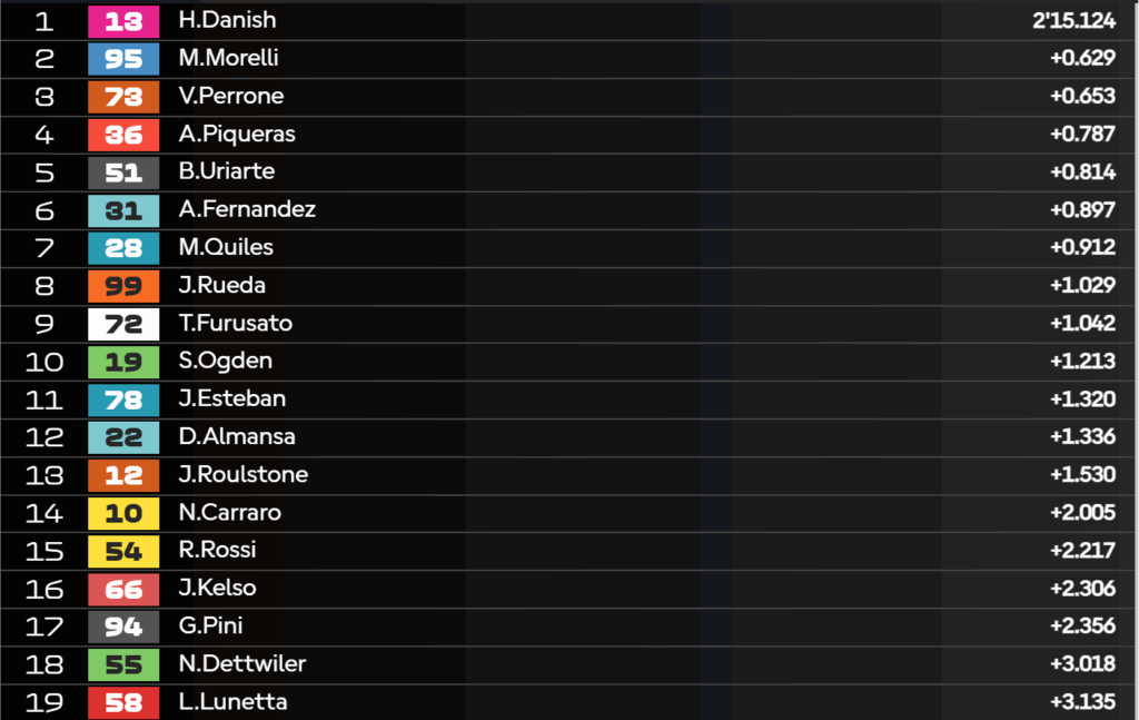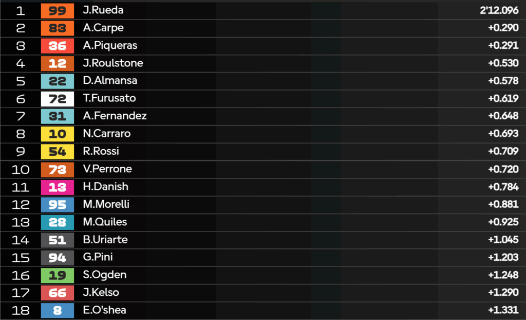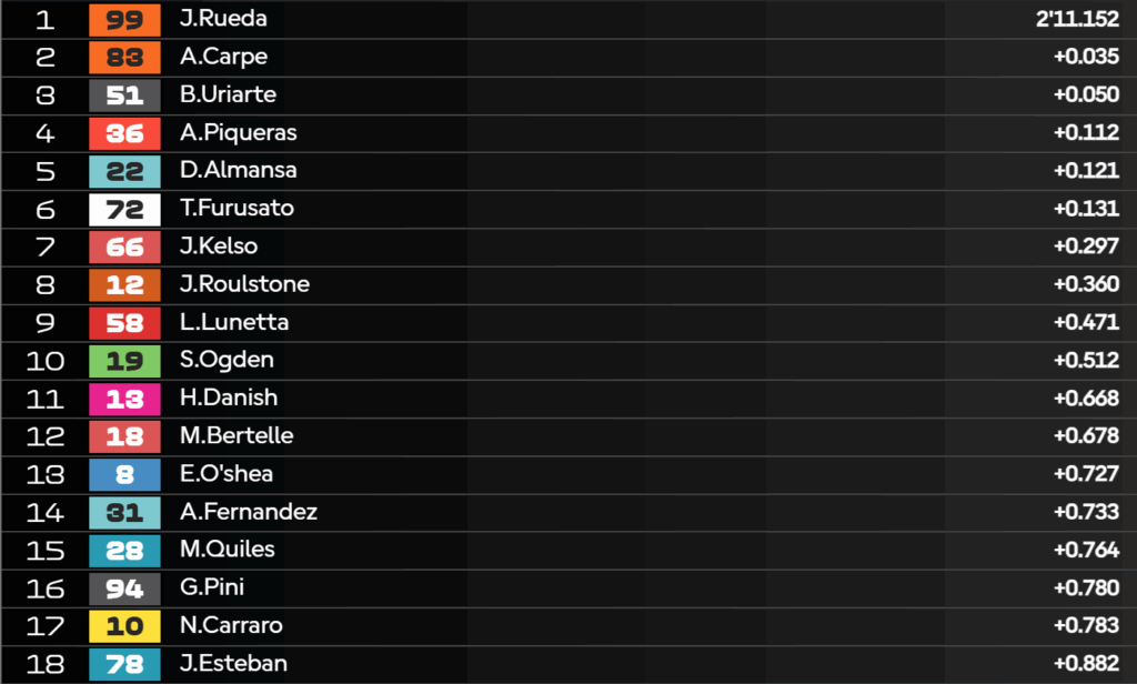 8:25 – Sventola la bandiera a scacchi: Rueda conquista la sessione, Lunetta si mette dentro i 14. A sorpresa partiranno dal Q1 sia Quiles (15°) che Pini (16°).