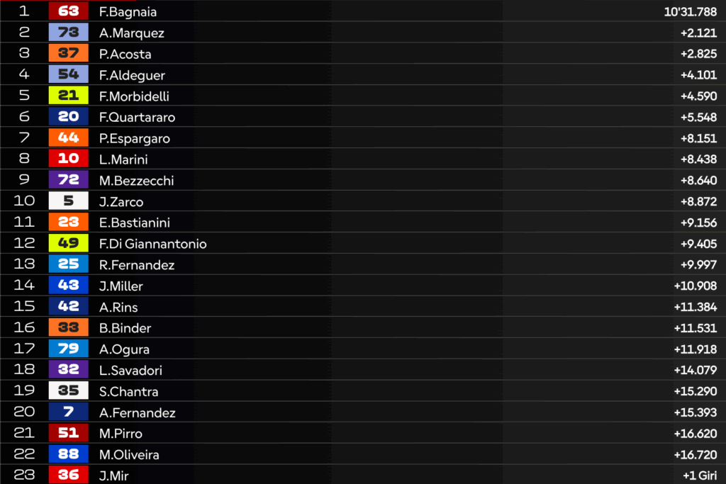 Giro 1 – Partiti! Mantiene la testa Bagnaia, seguono Alex Marquez ed Acosta.
