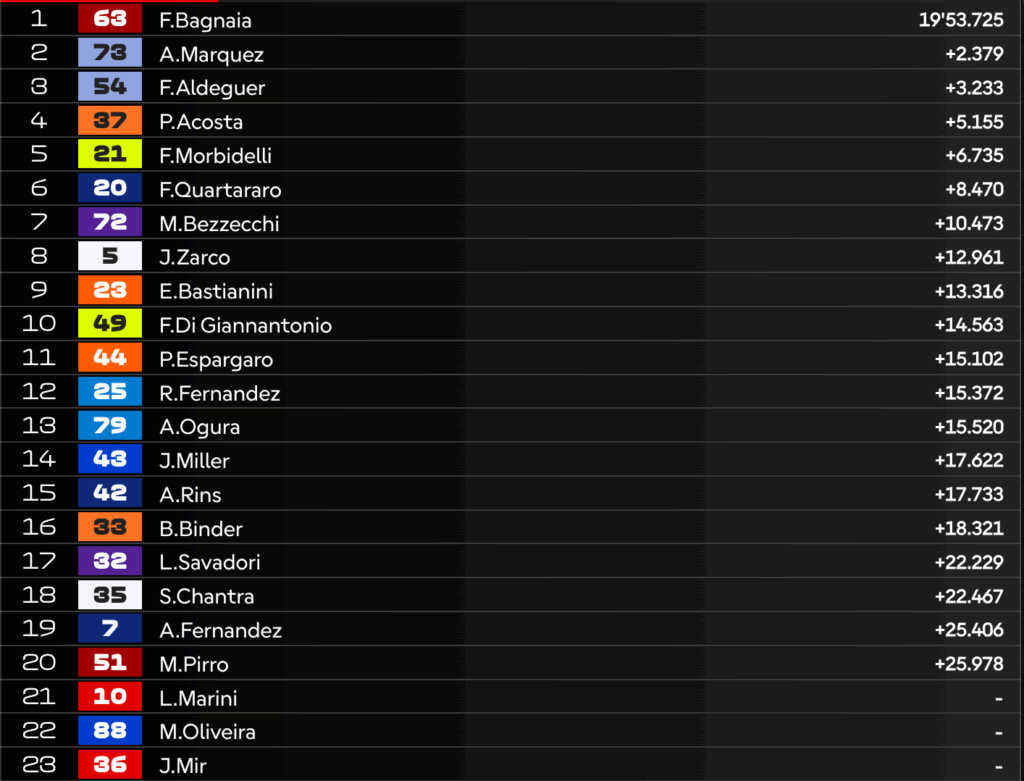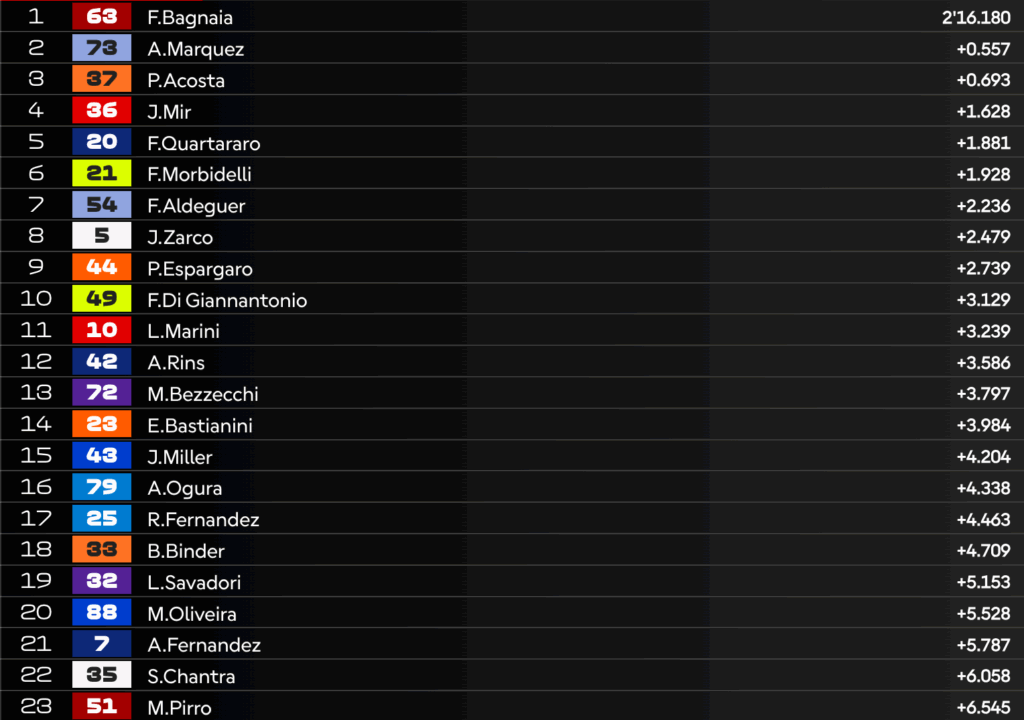 Giro 1 – Partiti! Mantiene la testa Bagnaia, seguono Alex Marquez ed Acosta.