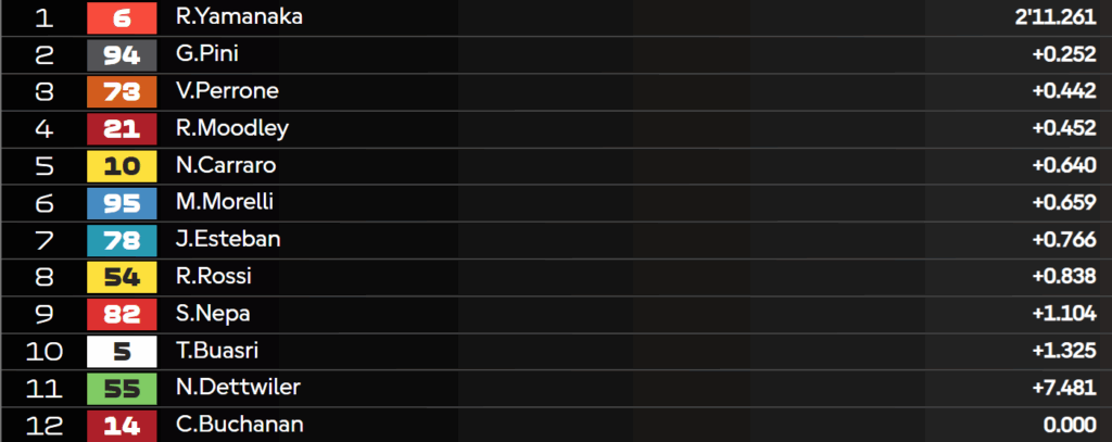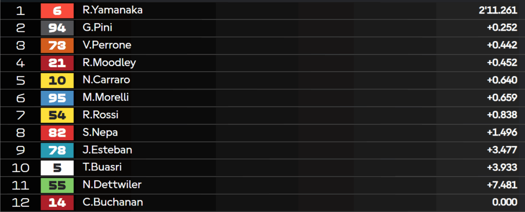 6:50 – Tanti gli italiani presenti in questo primo turno di qualifica: Pini, Carraro, Rossi e Nepa. Tuttavia, si prevede una sessione particolarmente difficile con anche Yamanaka, Esteban e Perrone in lotta per il passaggio al Q2. Per quanto riguarda Quiles, invece, è stato direttamente promosso al prossimo turno, visto il ritiro di Roulstone per il resto del weekend.