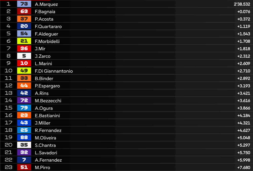 Giro 1 – PARTITI! Bagnaia mantiene la leadership, doppio scambio di posizioni tra Marquez (2°) ed Acosta (3°).