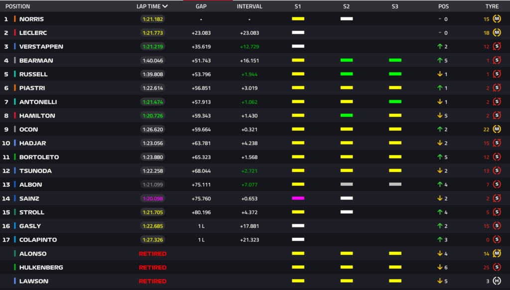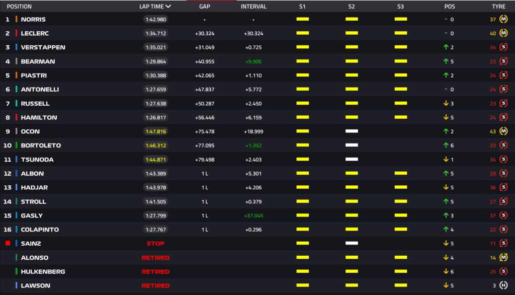 Giro 33 – Le posizioni a metà gara, tolte le soste Bearman sarebbe incredibilmente sul podio! La Haas, in dieci anni, non è mai arrivata in top-3.