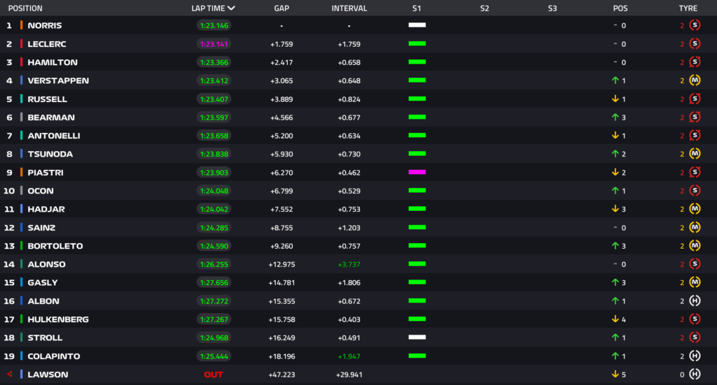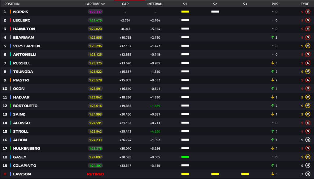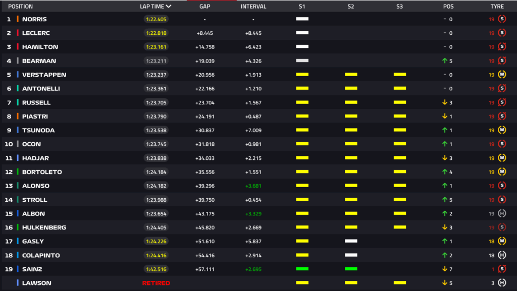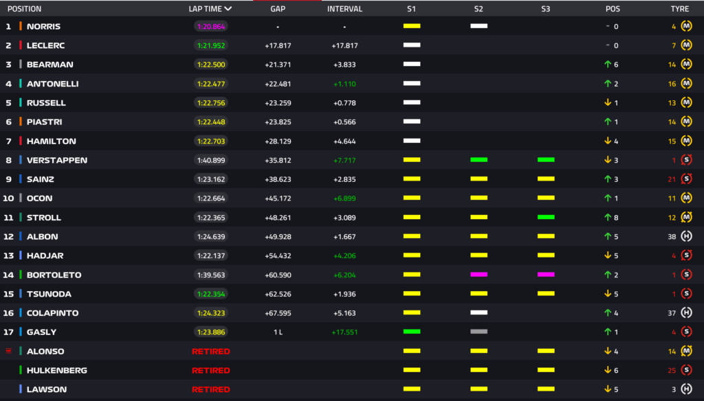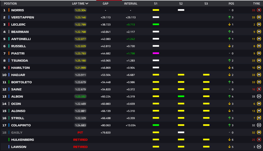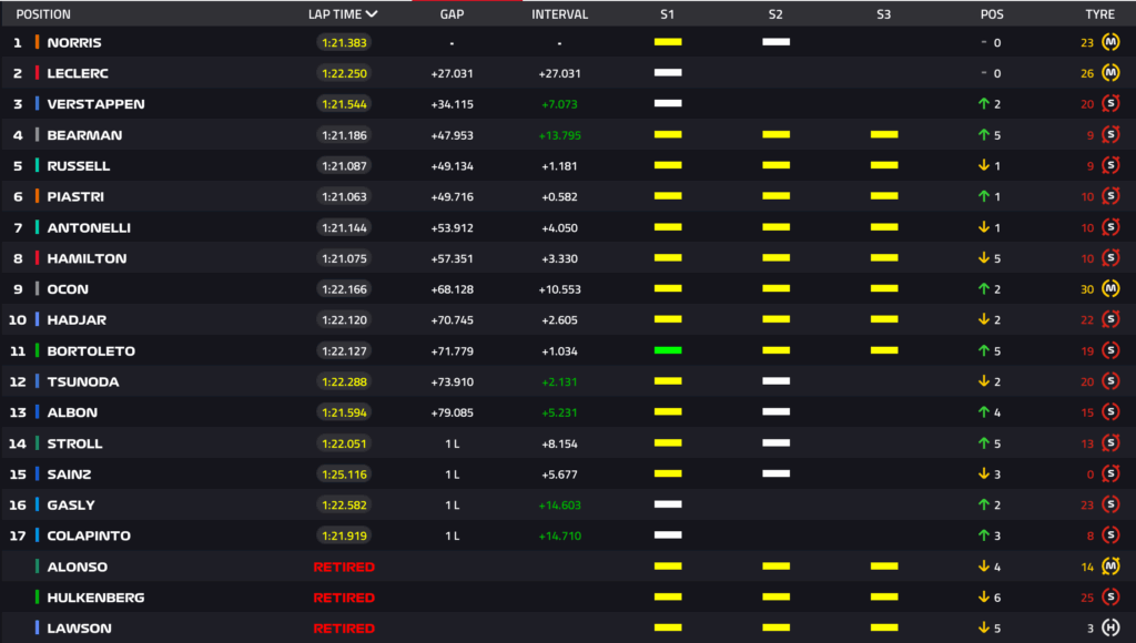 Giro 33 – Le posizioni a metà gara, tolte le soste Bearman sarebbe incredibilmente sul podio! La Haas, in dieci anni, non è mai arrivata in top-3.