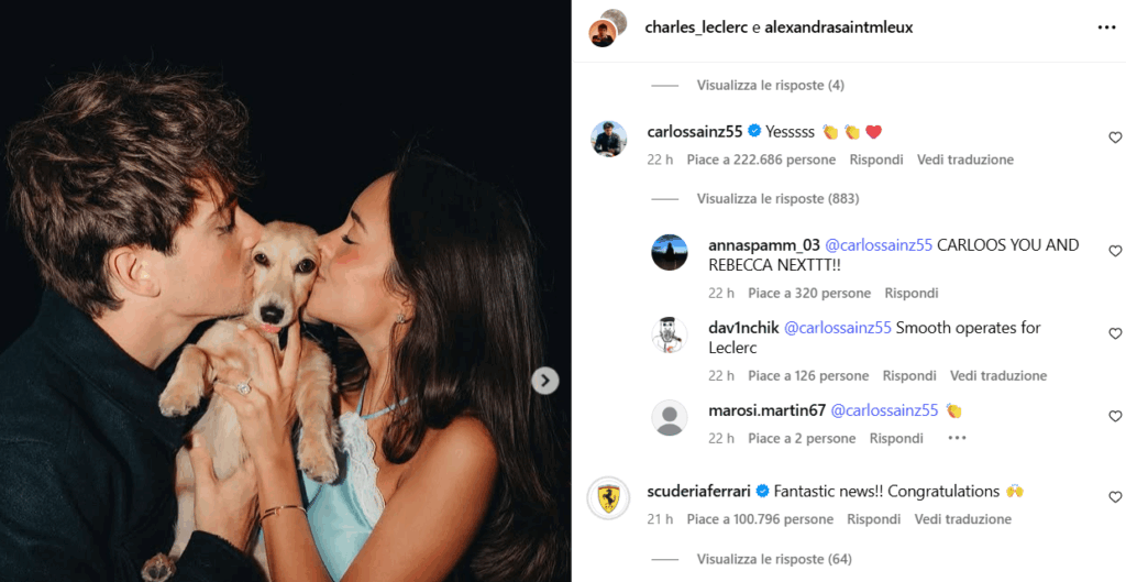 Lo spagnolo, ex compagno di squadra di Leclerc e suo ottimo amico, ha commentato con un semplice “Yesssss”, come se stesse esultando per la notizia o meglio ancora rispondendo al posto della sposa.