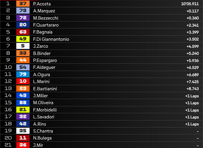 Giro 4 – Trittico Acosta-Marquez-Bezzecchi in testa, gli altri più distanti. Ritiro per Mir e Chantra.
