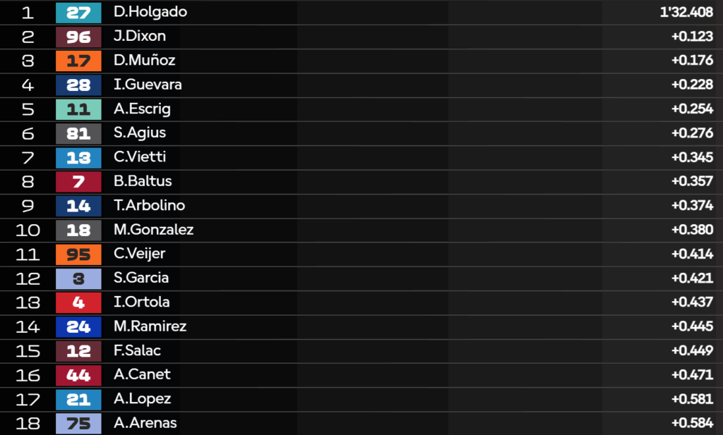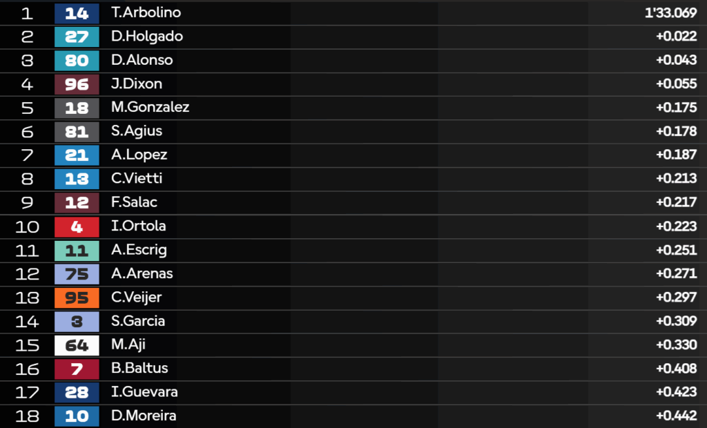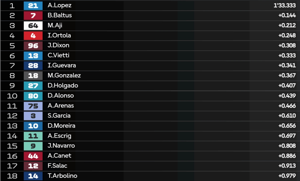 14:26 – I risultati di metà sessione: Gonzalez trova un giro veloce, mentre Moreira continua a lavorare solamente sul ritmo.