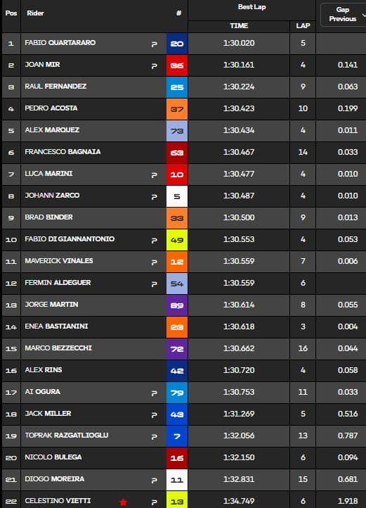 14:23 – Quartararo in prima posizione al momento: seguono poi Mir, Fernandez ed Acosta. Nelle ultime 4 posizioni Razgatlioglu, Bulega, Moreira e Vietti.