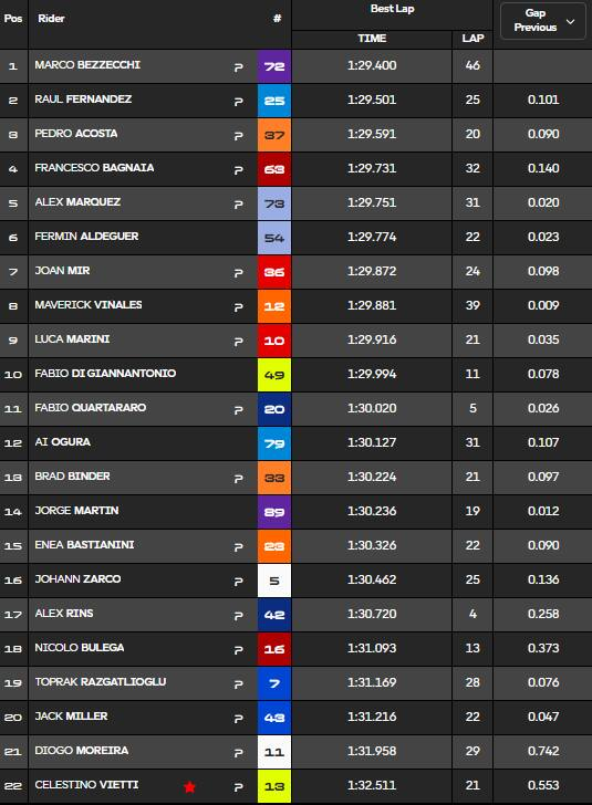 16:27 – DI NUOVO BULEGA! Quarto tempo a soli 2 decimi da Bezzecchi (1:29.661), ma cosa sta facendo Bubi!