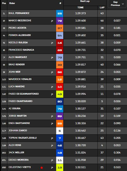 17:25 – Chiude 17° Enea Bastianini, a 9 decimi dalla vetta.