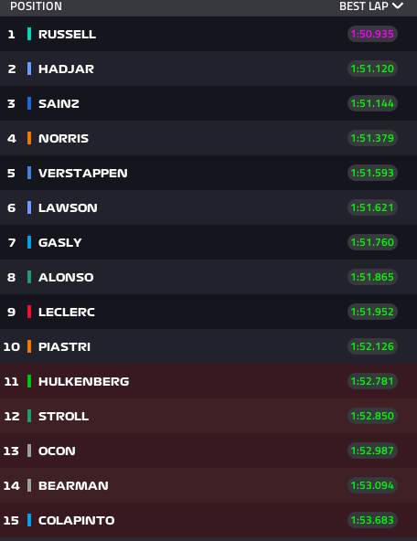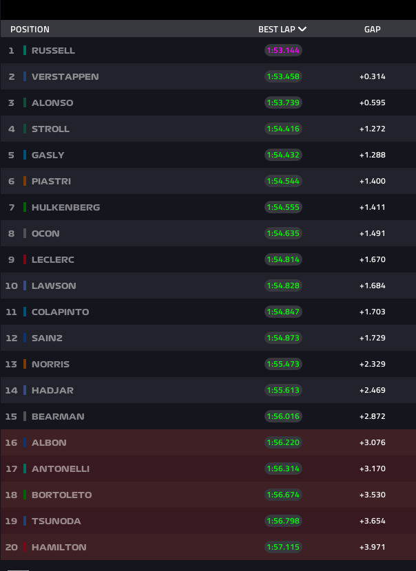 Nella seconda parte della sessione i tempi sono migliorati rapidamente, avvicinandosi a quelli del venerdì grazie all’asciugarsi dell’asfalto. Hamilton ha rischiato un contatto con Lawson, mentre molti piloti hanno atteso ai box in previsione di altra pioggia.