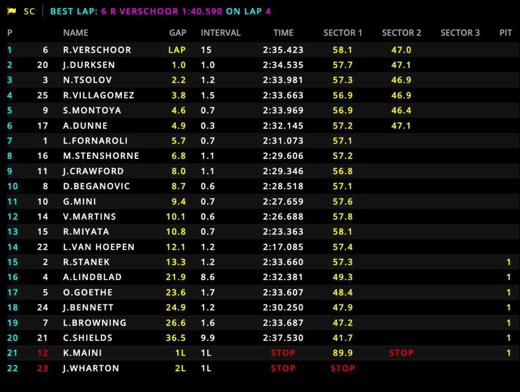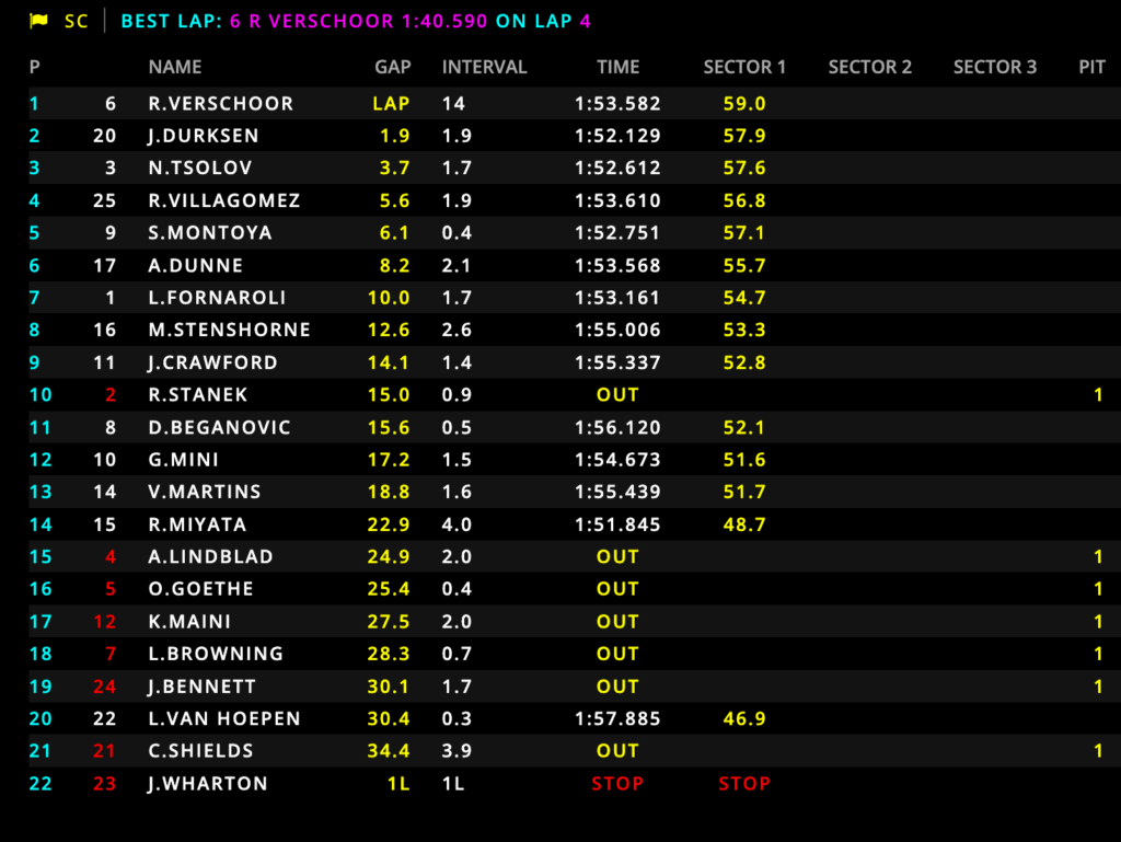 Giro 14 – Fermo Van Hoepen in pista, dopo essere stato colpito da Wharton (suo compagno di squadra): Safety Car!