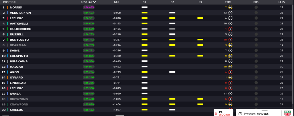 10:40- Norris con gomma media parte in vetta in 1:25:764, Russell e O’Ward al millesimo
