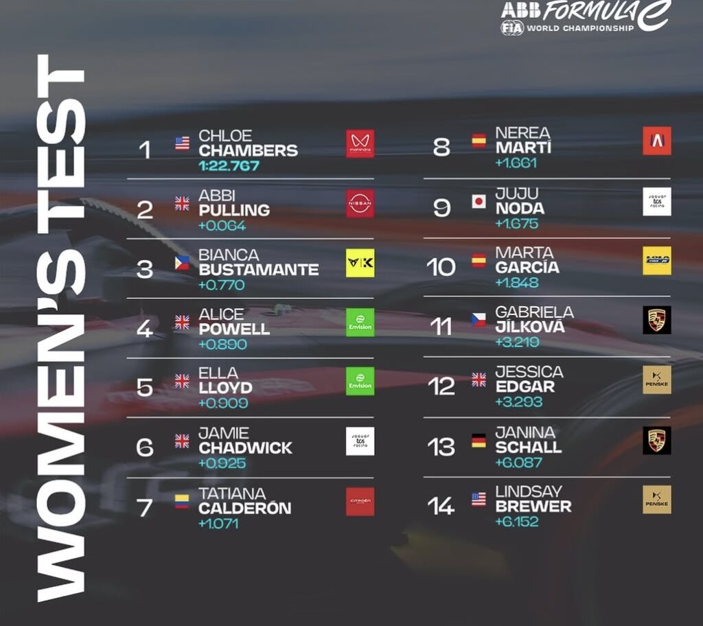 I risultati sono stati ancora più incoraggianti, in quanto la più veloce è stata Chloe Chambers, al volante della Mahindra, con il tempo di 1:22.767, appena quattro decimi più lento dell’1:22.318 del tempo di Joel Eriksson, ultimo classificato dei test prestagionali.