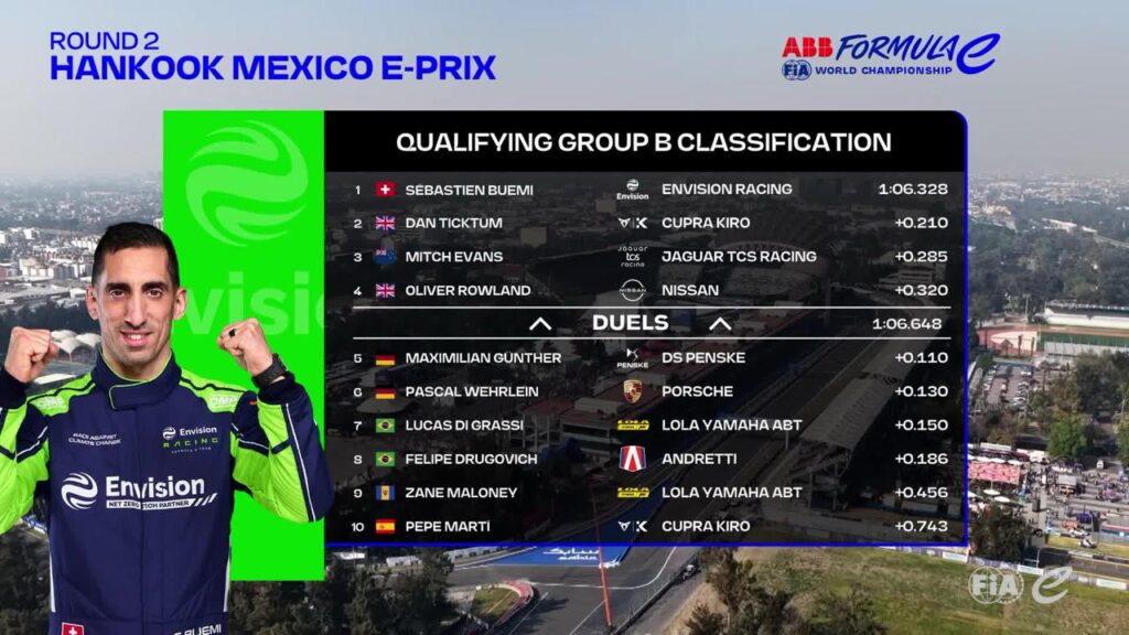 17:03 – 1:06.328 per Sebastien Buemi, che occupa momentaneamente la prima posizione del Gruppo B. Alle sue spalle, ci sono Dan Ticktum, Mitch Evans e Oliver Rowland, mentre è a sorpresa in settima posizione il poleman delle ultime due edizioni Pascal Wehrlein.