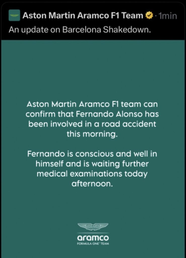 Il comunicato recita: “Aston Martin Aramco F1 Team può confermare che Fernando Alonso è stato coinvolto in un incidente stradale stamattina. Fernando è cosciente e sta bene, e sta aspettando nuovi esami medici questo pomeriggio.”