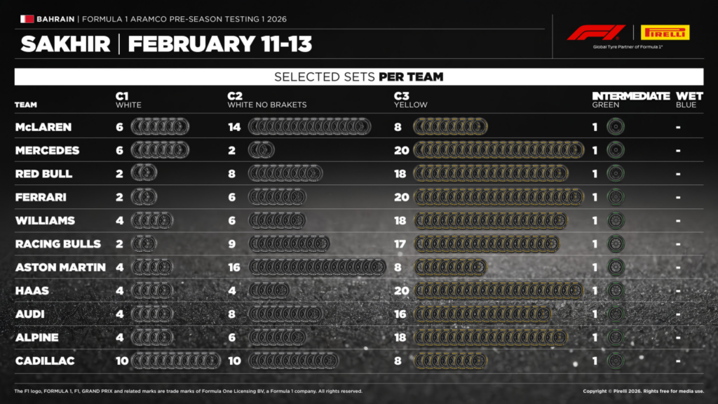 Red Bull è più equilibrata rispetto ai test di Barcellona con 2 treni di C1, 8 di C2 e 18 di C3. La McLaren, invece, ha solo 8 treni di gomme C3 e ben 14 di C2. Sorprende l’Aston Martin con 16 set di gomme C2 a fronte di 4 C1 e 8 C3.