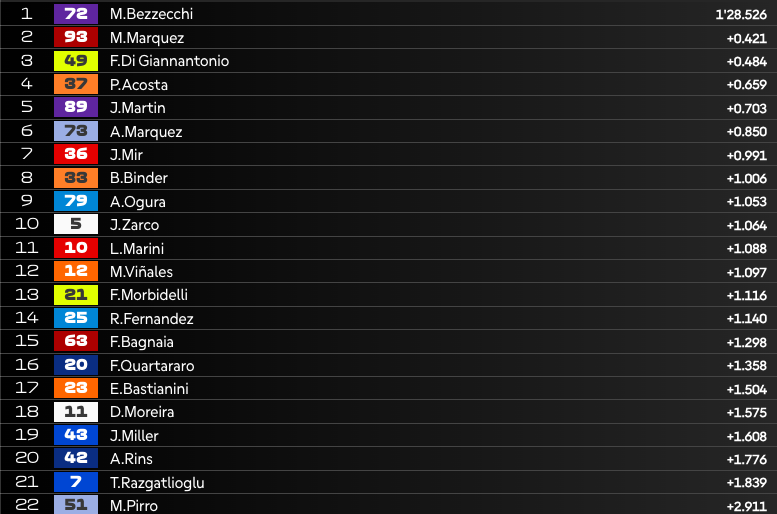 Se il buongiorno si vede dal mattino… beh, per i tifosi italiani è un inizio di mondiale niente male: nelle Pre-Qualifiche disputate a Buriram il miglior tempo va da uno straordinario Marco Bezzecchi, in 1:28.526, seguito da Marc Marquez (a 421 millesimi) e nuovamente da un altro nostro connazionale, Fabio Di Giannantonio, in 1:29.010.