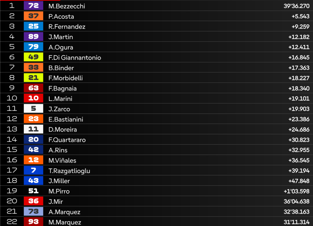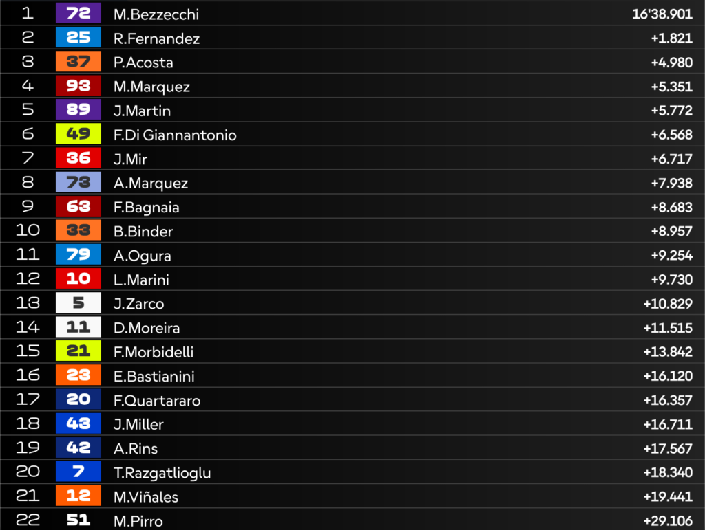 Stessa sorte per Joan Mir, anch’esso fuori gara, mentre Alex Marquez scivola sul finale. Da apprezzare anche la grande rimonta di Franco Morbidelli, 19° al primo giro, che chiude all’ottavo posto.