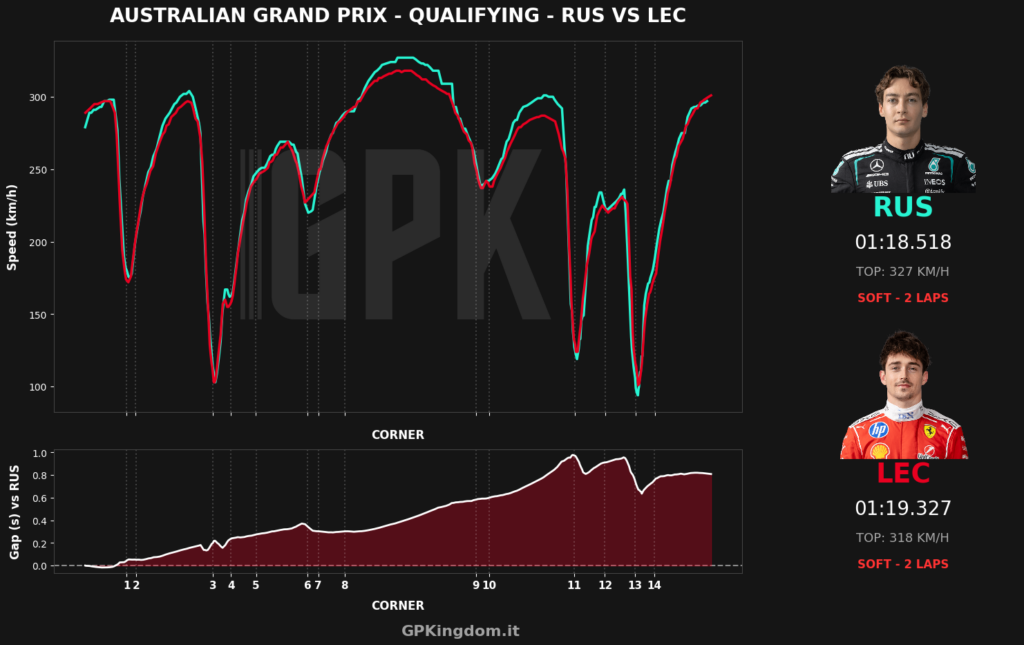 Se sul lato motore la Ferrari non sembra avere grande margine, il discorso cambia invece sul lato telaio e aerodinamica. La SF-26 recupera infatti moltissimo nelle curve secche come la 11 e la 13 e mantiene comunque un piccolo vantaggio anche in curva 3. Anche nelle pieghe a media velocità, come curva 6 e 7, riesce a recuperare circa un decimo, segno che la monoposto italiana è un passo avanti sul grip meccanico. Un vantaggio che però non riesce a compensare ciò che viene perso in termini di deployment dell’elettrico, indicato dagli stessi piloti della Rossa come la causa principale del distacco dalle Silver Arrows.