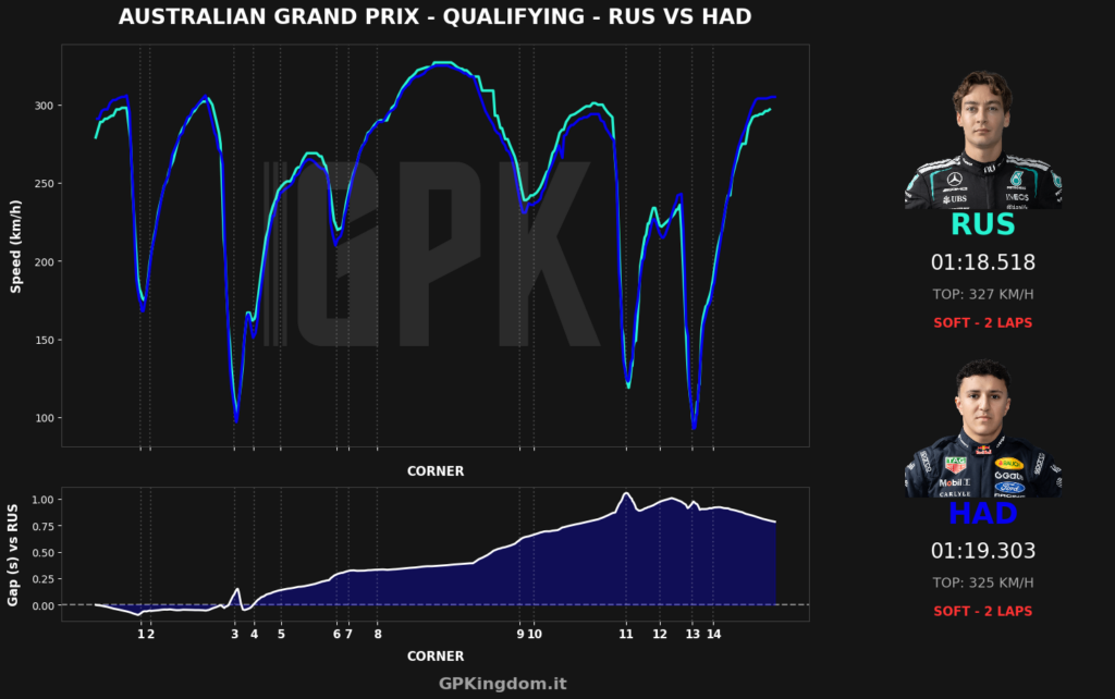 Un altro confronto obbligatorio è quello con i rivali di Red Bull. In questo caso si evidenzia come, lato power unit, Ford sembri aver trovato un modo di lavorare simile a quello della power unit di Brackley, anche se resta una grande incognita legata allo specifico assetto utilizzato ad Albert Park. In rettilineo il gap tra Russell e Isack Hadjar è praticamente nullo: l’unico punto in cui perde di più è nella fase finale del rettilineo, ma il problema si estende anche alla velocità di percorrenza di curva 9 e 10.