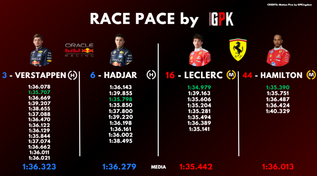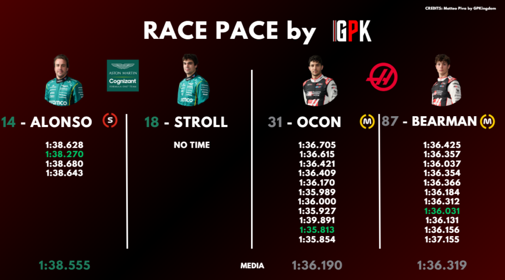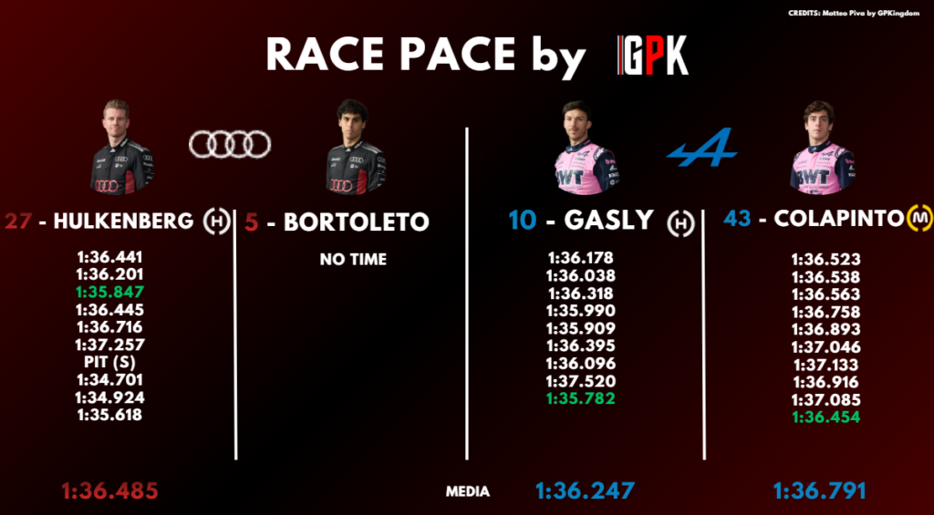 Dietro a questi tre team, troviamo la Red Bull, con Max Verstappen e Isack Hadjar che hanno però effettuato un long run con gomme dure. Alle loro spalle, a centro-gruppo, è lotta tra Haas e Alpine per gli ultimi piazzamenti a punti, con il team americano più competitivo però nella simulazione di qualifica.