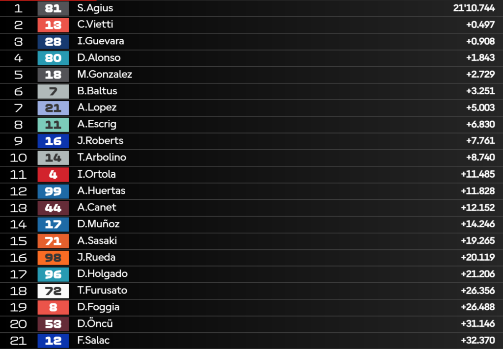 Attenzione a David Alonso che dalla diciassettesima posizione arriva in top-5 in soli 6 giri! Quando mancano pochi chilometri all’arrivo si accende la battaglia tra Agius e Vietti, ma l’italiano deve accontentarsi di un secondo posto.