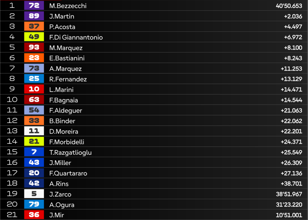Davanti Bezzecchi aumenta il proprio distacco (scrivendo anche il nuovo record di giri consecutivi in MotoGP) su Acosta, mentre dietro c’è una sfida al 4° posto tutta italiana tra Di Giannantonio e Bezzecchi. Rimane stabile però la situazione fino a metà gara, quando Ogura smuove la classifica sorpassando Pecco Bagnaia e Fabio Di Giannantonio.