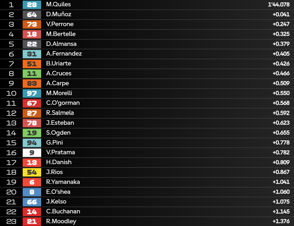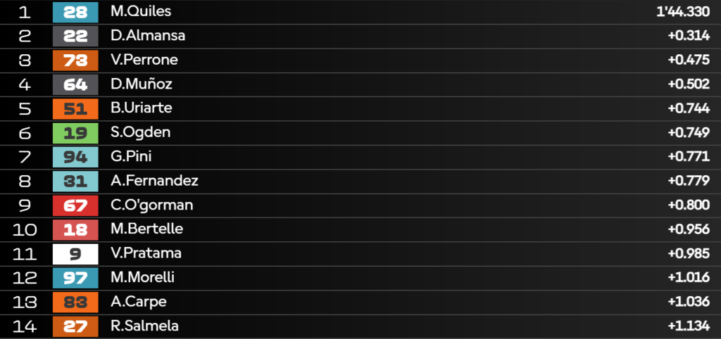 13:20 – Dopo il primo giro è Maximo Quiles a mettersi subito in testa, battendo il suo miglior tempo delle FP1 di quasi 2 decimi! Buon inizio di sessione anche per le KTM di Perrone e Uriarte, ma anche i due Intact sembrano essere abbastanza in forma nonostante siano appena tornati dopo i rispettivi infortuni.