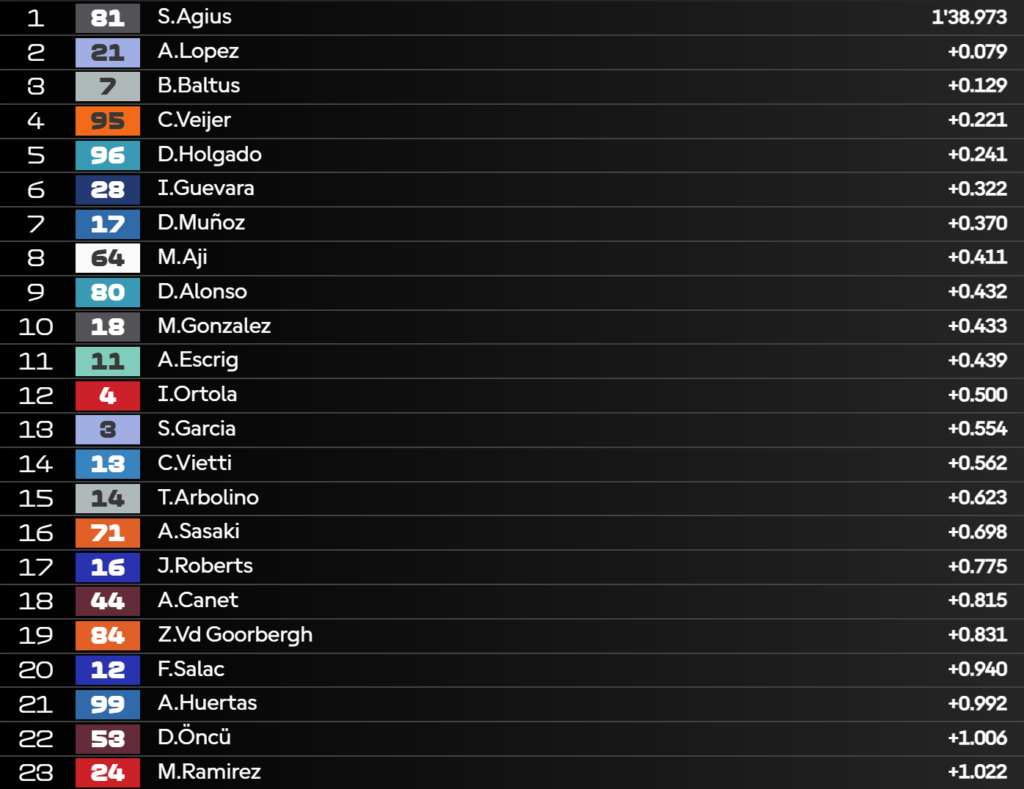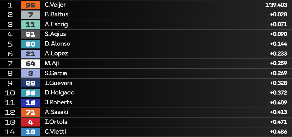 14:37 – Si migliora Dani Holgado: il pilota del Team Aspar si mette in seconda posizione, mentre la maggior parte dei piloti esce dai box per iniziare l’ultimo time attack.