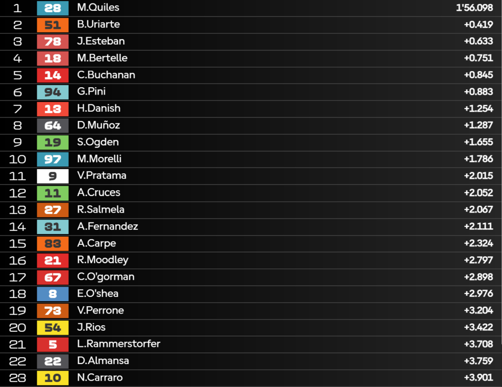 Si conclude qui la sessione con Maximo Quiles davanti a tutti. Bene però i due piloti del Team Level UP MTA che usando solamente i 10 minuti conclusivi si piazzano in terza e quarta posizione. A sua volta stupisce anche David Munoz: in appena due giri lanciati fa segnare l’ottavo tempo della sessione. Attenzione però alle condizioni meteo perché nel frattempo ha ricominciato a piovere!