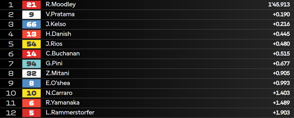 Passano al Q2 Moodley, Pratama, Kelso e Danish. Pini partirà dalla ventunesima posizione, mentre Carraro dalla casella numero 24.