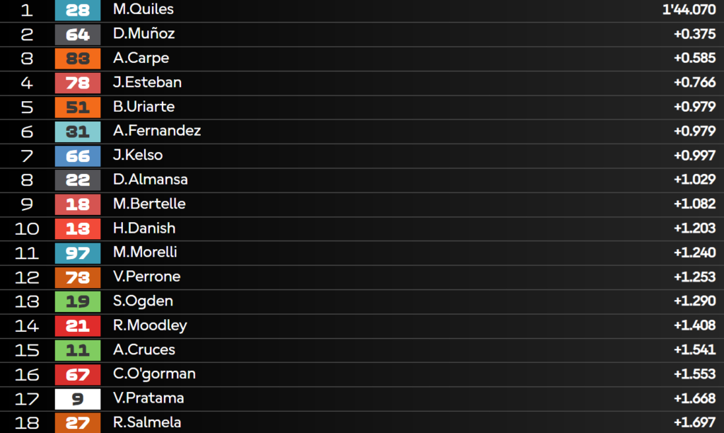 13:19 – Quiles è l’unico ancora in pista e segna il miglior tempo con gomma dura al posteriore. È da vedere se riuscirà a tornare ai box in tempo per montare la morbida e tentare un ultimo time attack.