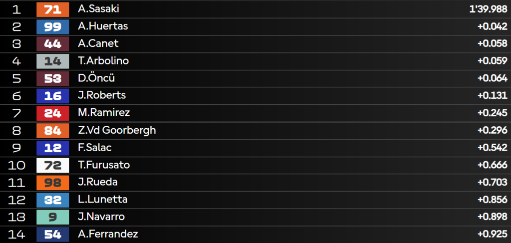 13:53 – Dopo il cambio gomme tutti i piloti sono in casco rosso: Sasaki in testa, seguito da Huertas che sfrutta la scia di Oncu per mettersi proprio davanti al pilota turco.