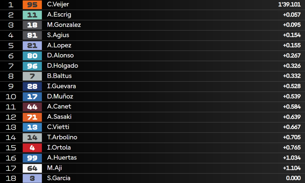 Si conclude qui il Q1 con solamente 64 millesimi tra il primo e il quinto! Arbolino e Canet passano il taglio all’ultimo giro disponibile.