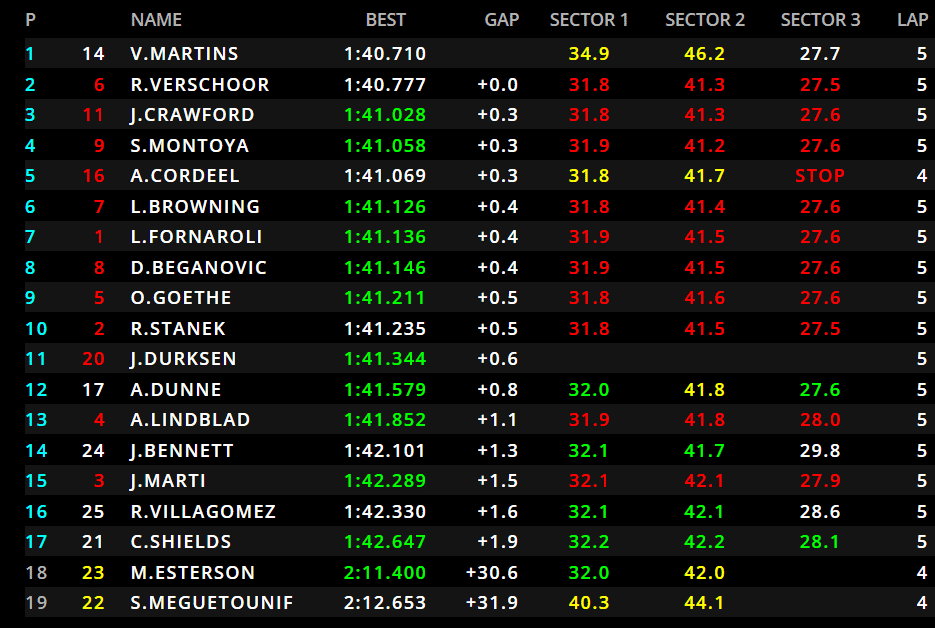 16:06 – Secondo tentativo con le stesse gomme per tutti i piloti: sale terzo Crawford davanti a Montoya, mentre si gira alla penultima curva anche Cordeel, il quale però, a differenza di Esterson, non riesce a far ripartire la sua Rodin. Bandiera rossa e sessione finita per il pilota belga!
