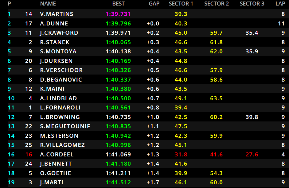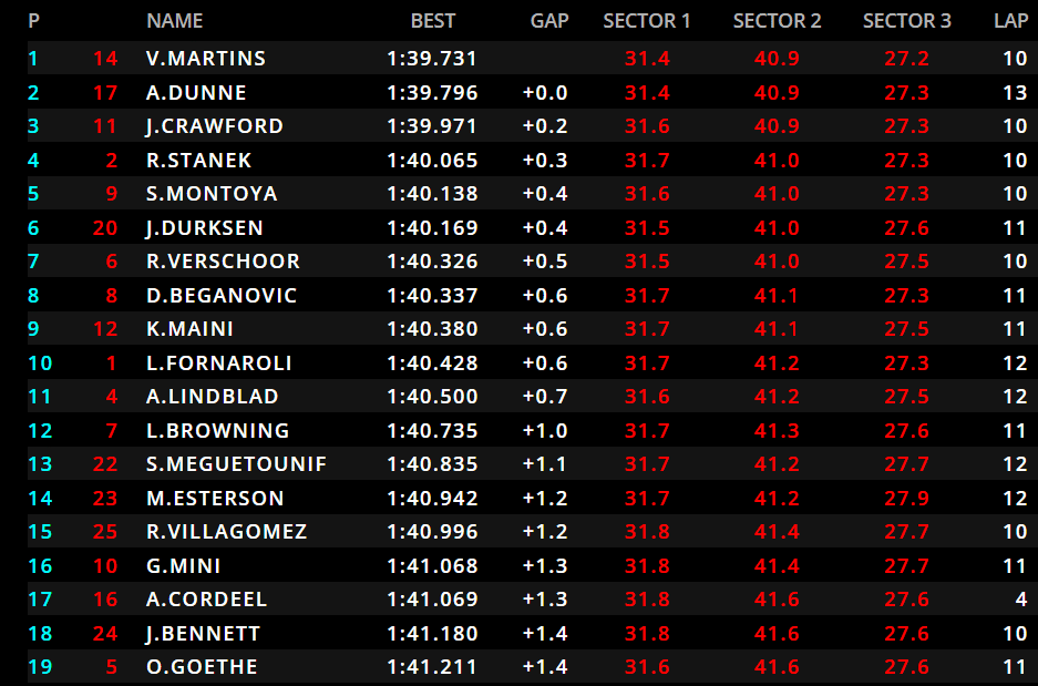 16:16 – Ottimo giro per Alex Dunne, che sale in terza posizione e si mette subito alle spalle del suo rivale in campionato Richard Verschoor, a meno di un decimo da Victor Martins.