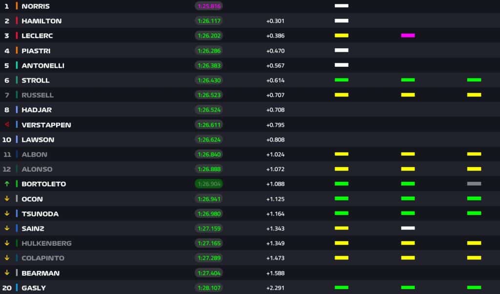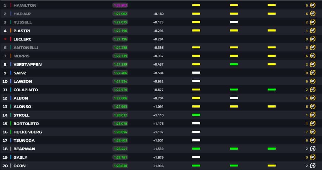 17:12 – Lewis si riprende la miglior prestazione, lo segue Isack Hadjar a 0.160 sec di distacco.