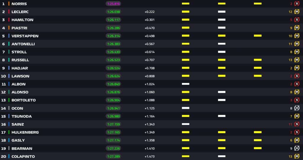 17:35 – La classifica dopo i primi tentativi di simulazione qualifica con mescola morbida: