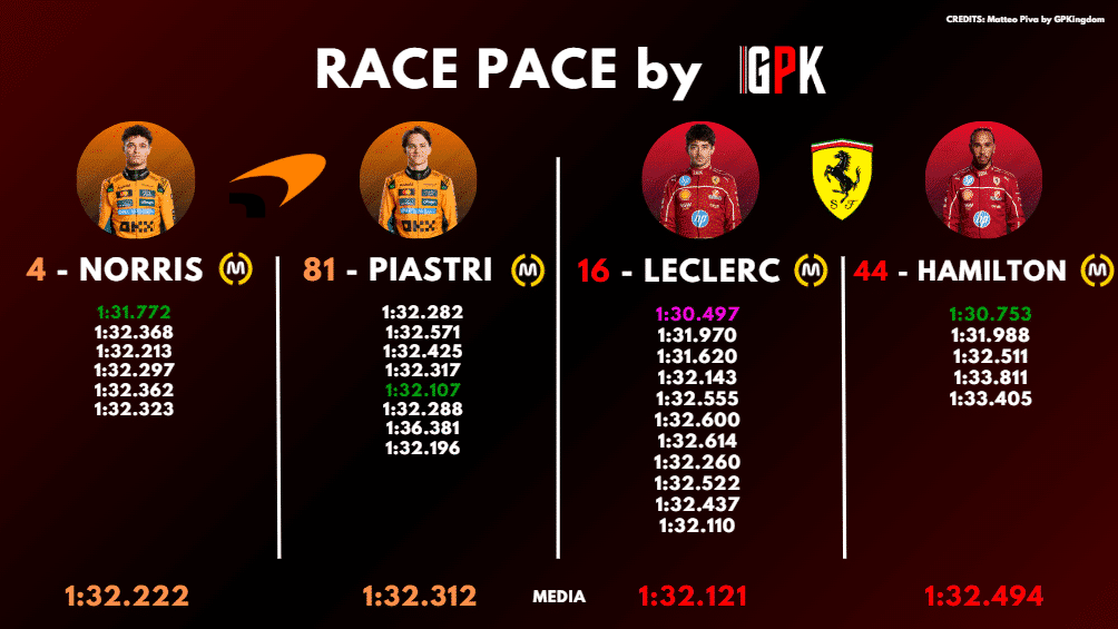 Se guardiamo le medie dei passi gara nella prima foto, notiamo che il tempo più basso non è dei piloti McLaren, bensì di Charles Leclerc, autore anche del giro più veloce, 1:30.497. Entrambi i piloti Ferrari, però, a differenza di tutti gli altri, hanno provato a dare una “frustata” alle gomme, spingendo molto nel primo giro per poi stabilizzarsi sull’1:32.