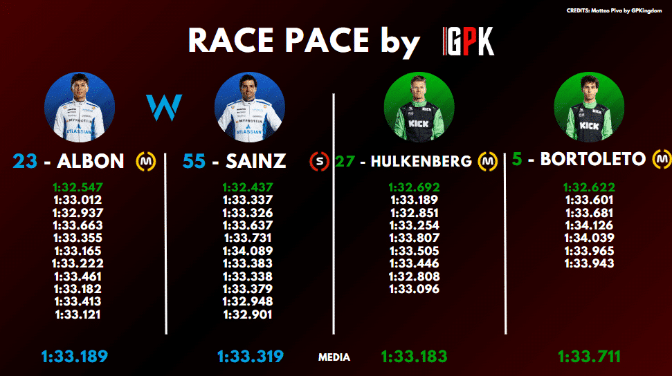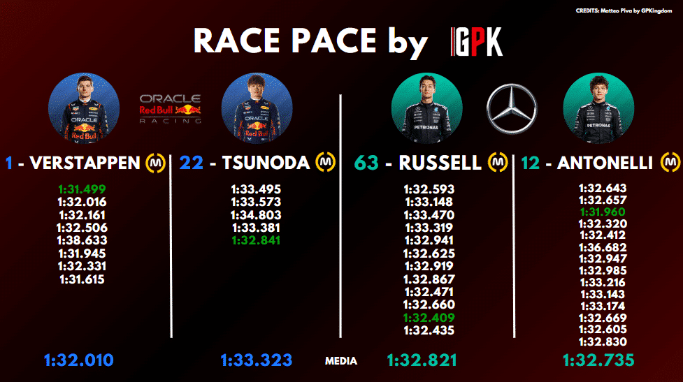 Però, Il passo gara più veloce in assoluto – dal punto di vista delle medie – è stato della Red Bull di Max Verstappen, che dopo 8 giri è riuscito addirittura a far registrare un 1:31.615. Però, il quattro volte campione del mondo soffre soprattutto nel giro secco, in quanto ha concluso le FP2 a 5 decimi dal leader Lando Norris. Sappiamo che però è sempre sbagliato escludere dalla lotta per la vittoria Max Verstappen.
