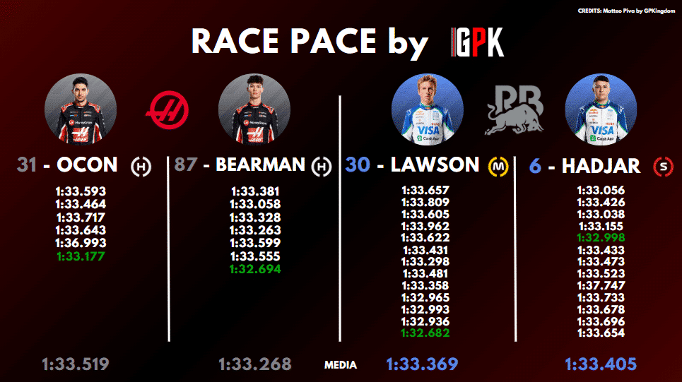 In particolare, tutti i piloti dei top team hanno optato per le gomme medie, che saranno sicuramente le più usate in gara. Però, anche le altre due mescole hanno offerto riscontri interessanti, con la gomma dura che è stata montata dai due piloti della Haas, e la gomma morbida da Isack Hadjar e Carlos Sainz.