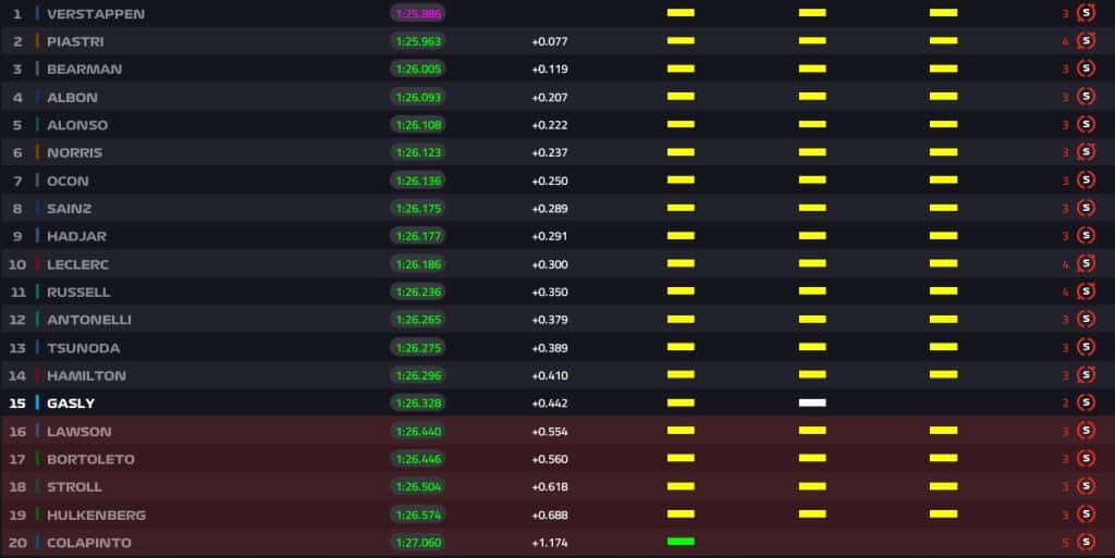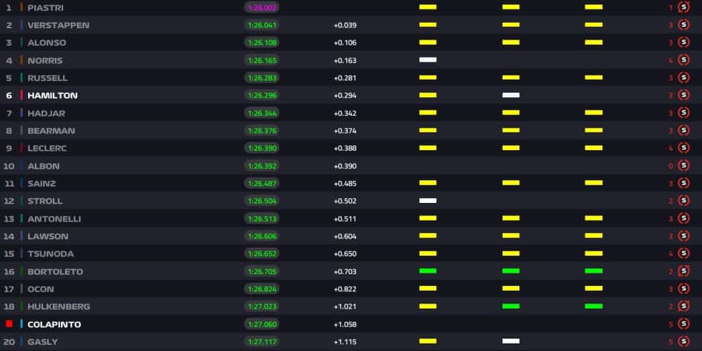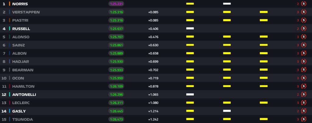 16:09 – Il primo tentativo di Alonso vale la terza posizione a 106 millesimi di distacco da Piastri (1°).