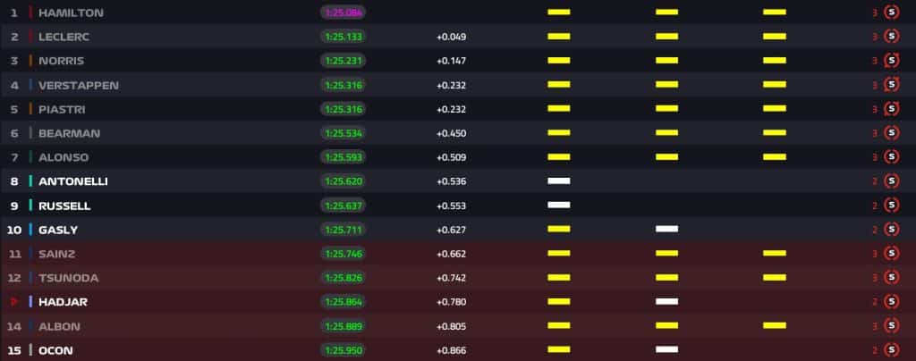 16:08 – Hadjar sale al settimo posto, lo segue Oliver Bearman che scavalca anche Charles Leclerc.
