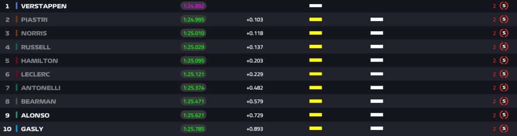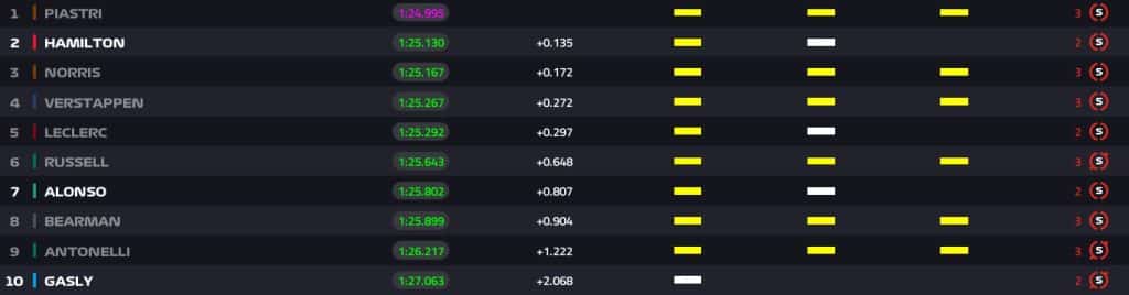17:01 – Verstappen chiude il primo giro in 1:25.267. Piastri primo in 1:24.995! Norris terzo a 0.172 millesimi da Piastri. Lewsi Hamilton in seconda posizione.
