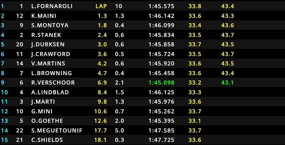 14:26 – Scende sotto il secondo il distacco tra il leader della corsa Fornaroli e Kush Maini, attualmente in seconda posizione.